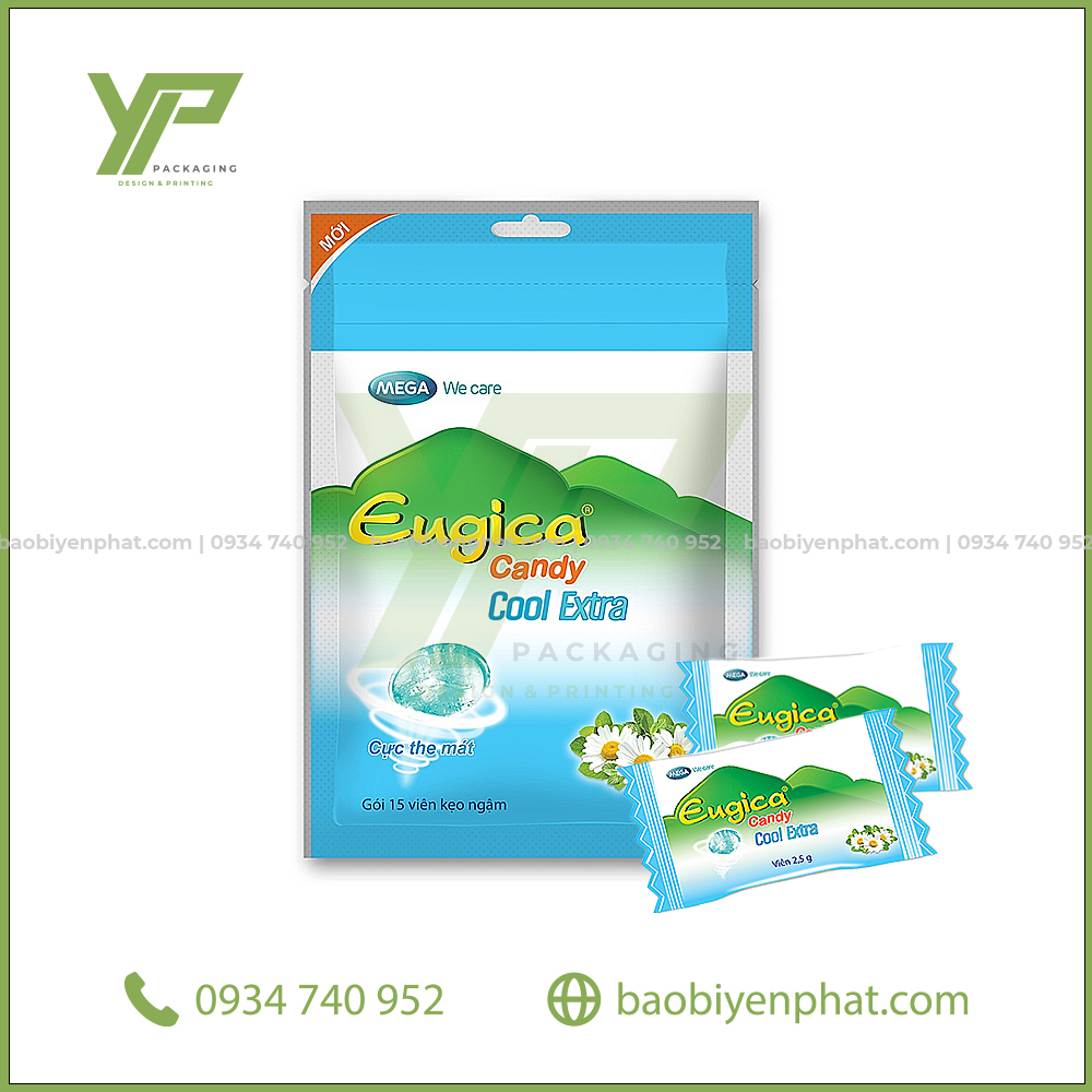 Mẫu túi kẹo ngậm Eugica in màng ghép và cuộn màng đóng gói tự động