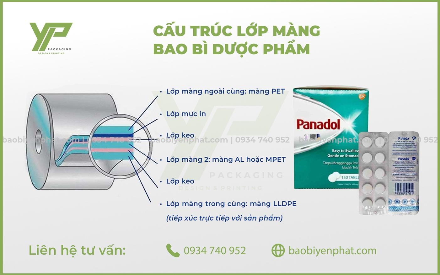 Một bao bì đóng gói dược phẩm thường có cấu trúc màng phổ biến như: PET/AL/LLDPE, PET/MPET/PE,...