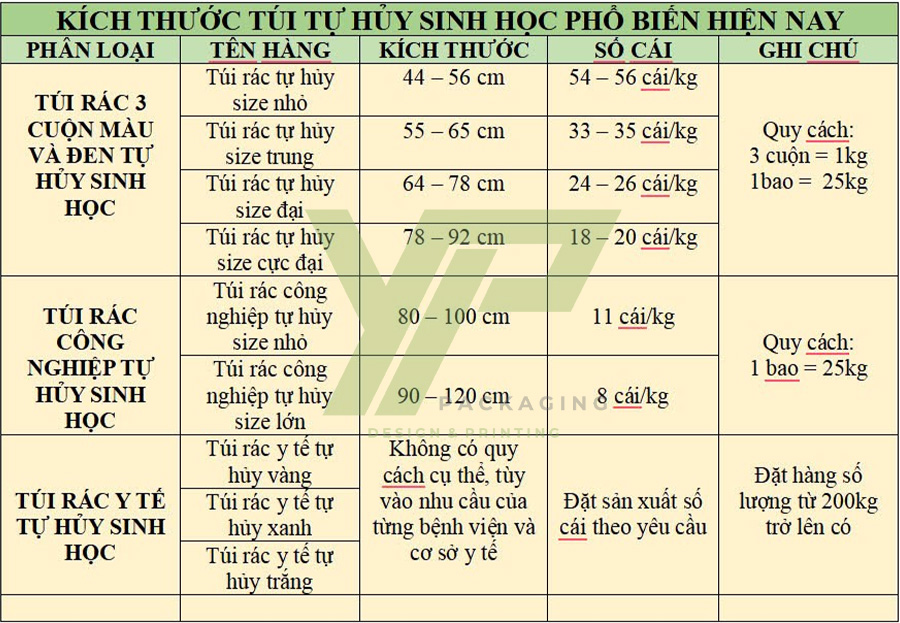 Bảng size túi rác tự huỷ sinh học
