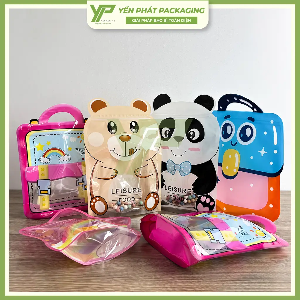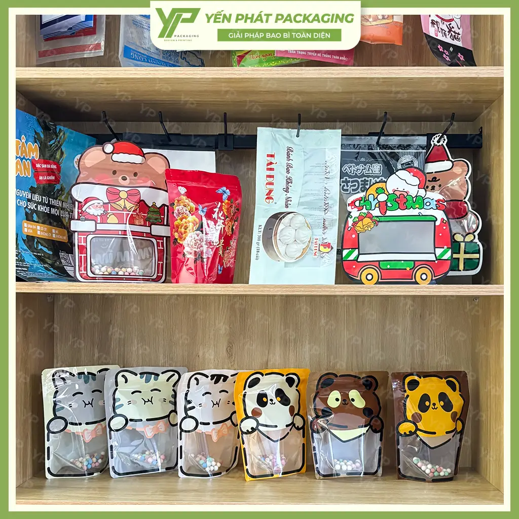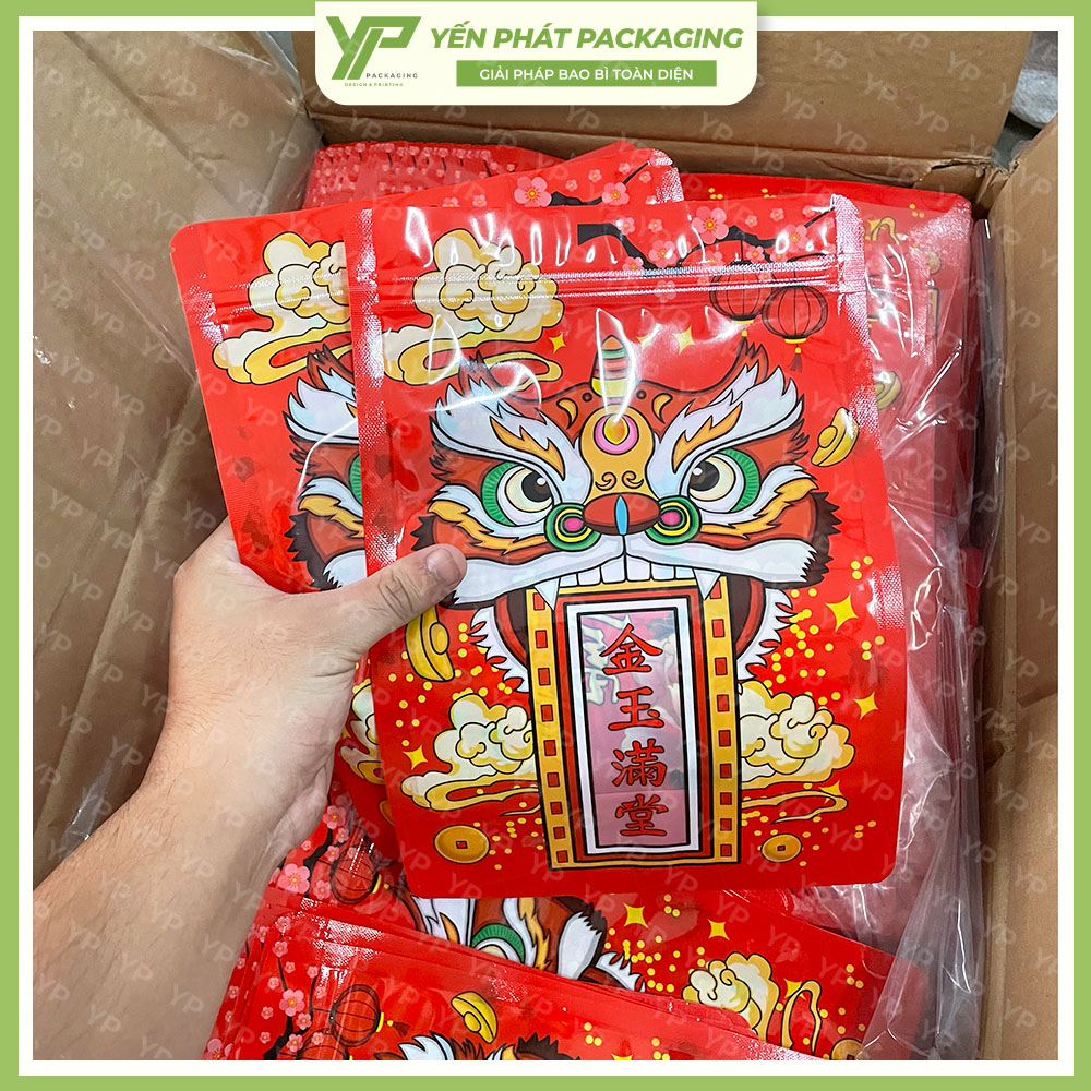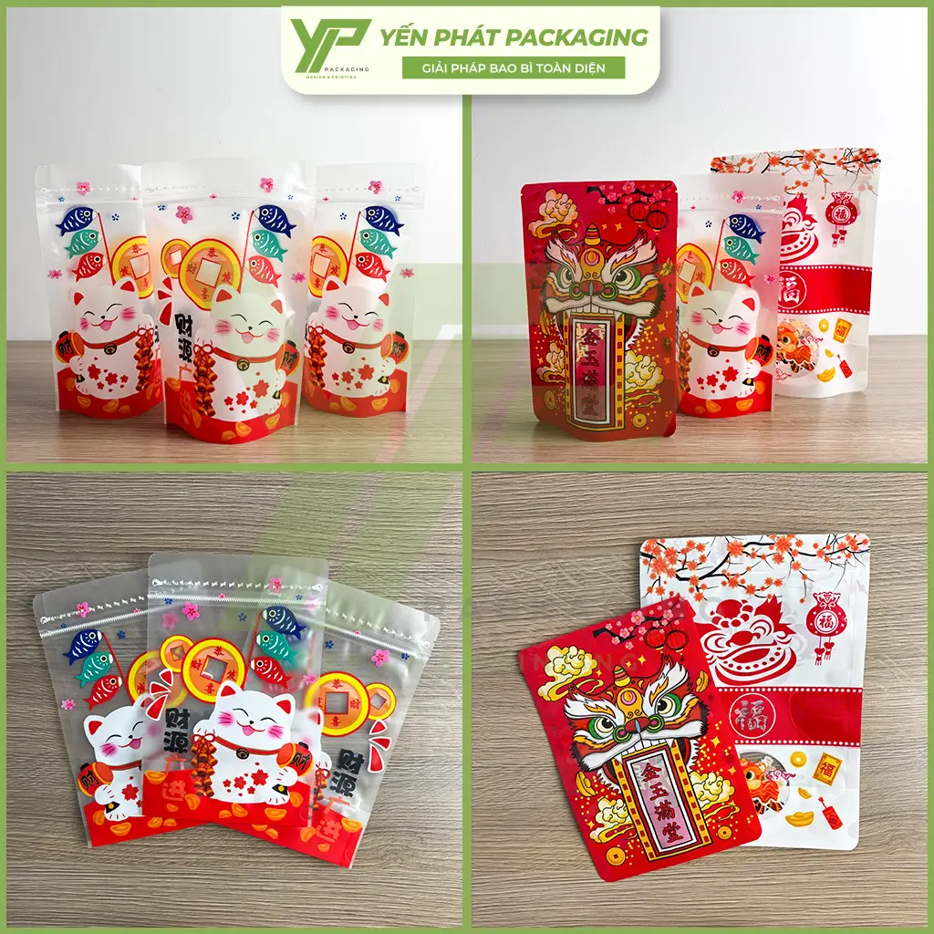 - Túi Zip (Zipper): Túi zip lụa mờ hoặc zip bạc, đáy đứng, rất phù hợp đựng các loại hạt, mứt, khô gà, khô bò ngày Tết.