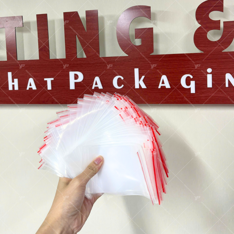 Bao Bì Yến Phát sản xuất túi zip chỉ đỏ bằng chất liệu nhựa PE/PP nguyên sinh, cùng với hệ thống máy móc hiện đại và đội ngũ giàu kinh nghiệm, túi zip chỉ đỏ do chúng tôi sản xuất có kích thước chính xác và chất lượng đồng đều cực kì cao.